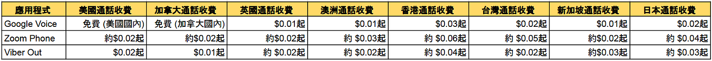 根據官方資料,下圖列出了 Google Voice、Zoom Phone 和 Viber Out 對部分地區的通話收費(以每分鐘美元計算)供參考。然而,收費會因帳戶類型和訂閱計劃等因素有所不同,並隨時間而有所變動。因此,建議瀏覽各服務的官方網站,以獲取最新資訊。